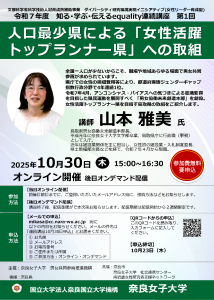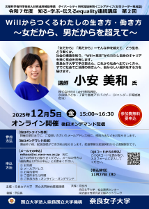 equality(”平等”)は、全ての人が等しく尊重・大切にされることです。一般の皆さまを対象とした〝知る・学ぶ・伝えるequality”連続講座は、奈良女子大学が主催する7つの地域貢献事業のひとつとして、男女共同参画推進機構が平成22年度から実施しています(平成24年12月、男女共同参画推進室は男女共同参画推進機構になりました)。ありのままの自分を好きになり心を元気にするための秘訣や、お金やモノからは得られない本当の豊かさについて参加者に様々な視点から楽しく学んで頂きます。